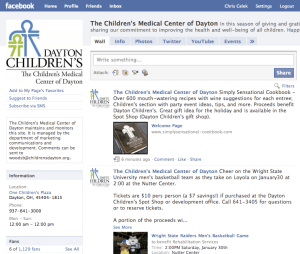 I’d also suggest folks look into doing advertising on Facebook as a way to compliment their Fan Pages, as you can do very specific geo-targeting and demographic and psychographic targeting. For example, Dayton Children’s could target ads to people age 20 – 60 who live within 50 miles of Dayton.