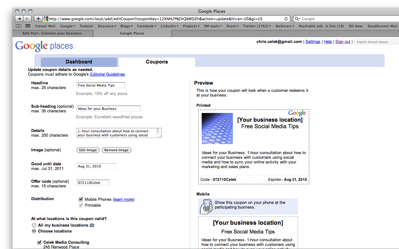 Among the tools Google offers for free to business are Places and Maps along with a nifty coupon service.